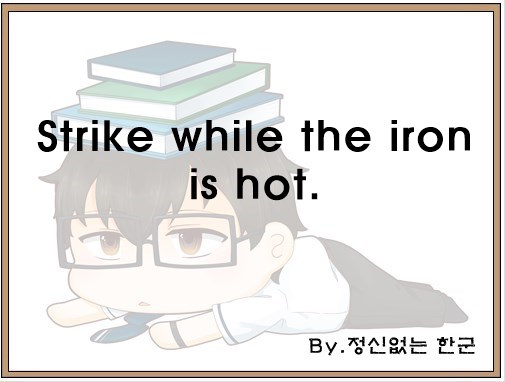 Strike while the iron is hot. (쇠는 뜨거울 때 두드려라, 때(기회)를 놓치지 말라).
