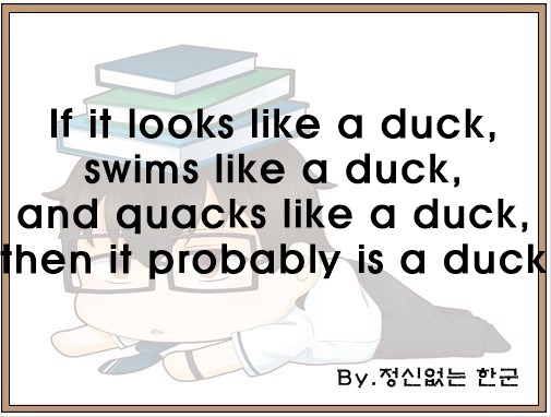 if it looks like a duck and quacks like a duck, it is a duck 혹은 if it looks like a duck and walks like a duck, it is a duck 등 다양한 버전이 있습니다.