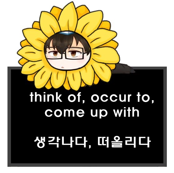 이러한 뜻을 가진 동사 표현은 다양하게 있습니다만, 대표적으로 think of, occur to, come up with 세 가지를 주로 씁니다.