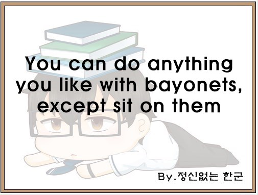 오늘은 "You can do anything you like with bayonets, except sit on them"이라는 영어 속담을 공부했습니다.