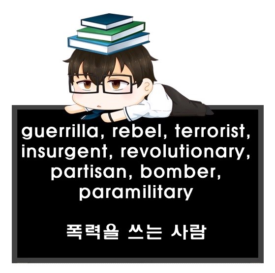 ## 명사 guerrilla, rebel, terrorist, insurgent, revolutionary, partisan, bomber, paramilitary 차이 공부하기.