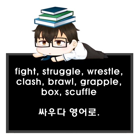 ## 동사 유의어 fight, struggle, wrestle, clash, brawl, grapple, box, scuffle 뜻, 뉘앙스, 어감 차이.